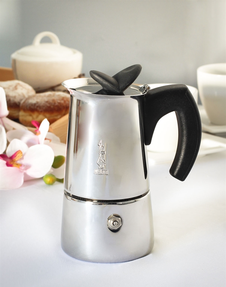 Кофеварка на четыре чашки 160 мл может заваривать кофе на газовых, электрических и керамических плитах.