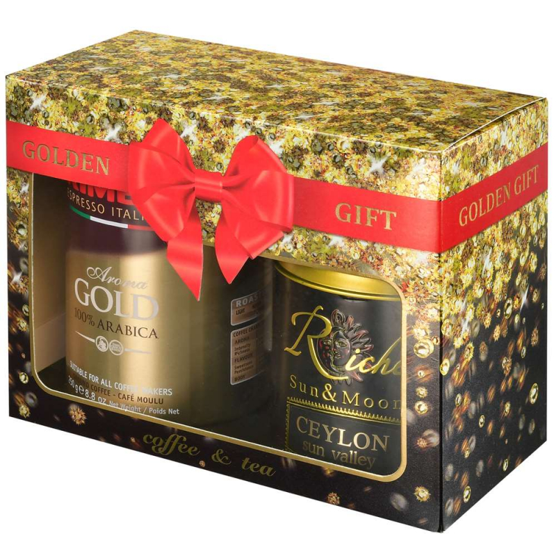 Подарочный набор: Kimbo Кофе Голд 100% Арабика натуральный жареный молотый 250г ж/б плюс Чай ченый Riche Natur Цейлон 100г