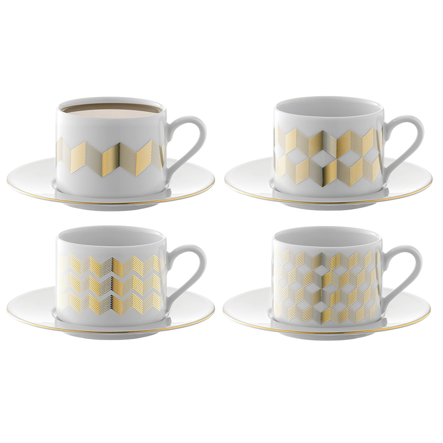 В набор входят 4 чашки и 4 блюдца из качественного фарфора, украшенные золотым орнаментом, который наносится вручную.